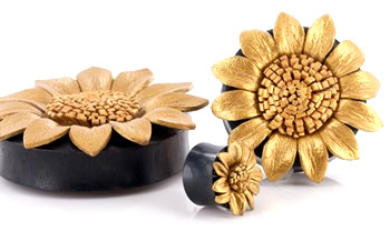 Плаги из дерева ручной работы с цветком из кожи, площадь цветка значительно превышает площадь плага, за счет чего даже небольшие размеры выглядят очень эффектно.