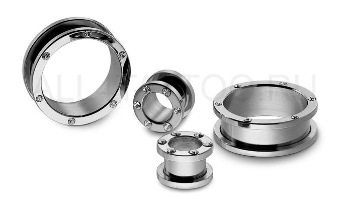 Тоннели из хирургической стали 316L, украшенные прозрачными стразами. Количество стразов у разных диаметров варьируется от 6 до 12.