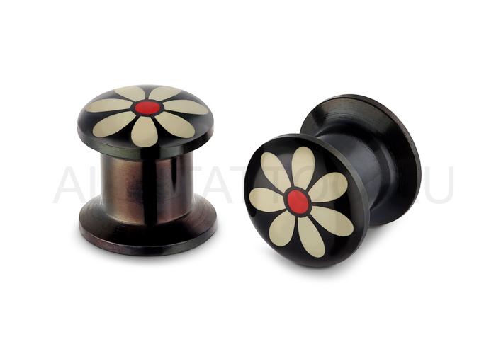 Плаги из хирургической стали 316L с вставкой из прозрачного акрила с изображением цветка ромашки.
