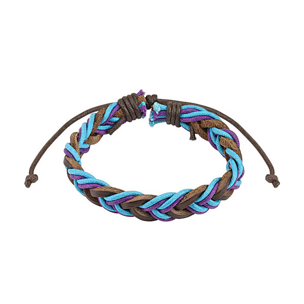 Браслет из сплетённых коричневых кожаных полос и текстильных шнурков светло-голубого и сиреневого цветов.