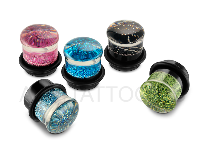 Плаги из прозрачного акрила с эффектом линзы и переливающимися включениями.