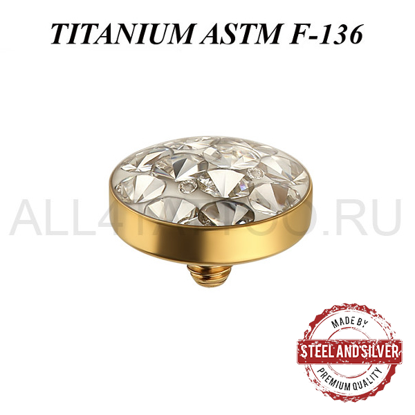 Накрутка из имплантационного титана ASTM F-136 с золотым 24х каратным PVD покрытием. украшена прозрачными Premium Crystals. Резьба накруток 1,2мм подходят к микродермалам и украшениям толщиной 1,6мм с внутренней резьбой.
