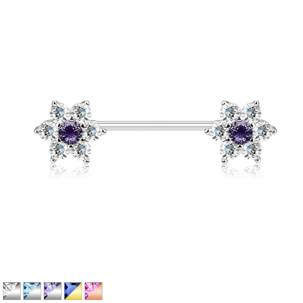 Украшение для груди со штангой из хирургической стали 316L с цветами из родированной латуни, украшенными стразами. Представлена вариация с золотым покрытием и синим кристаллом, а также с покрытием розового золота и розовым кристаллом.