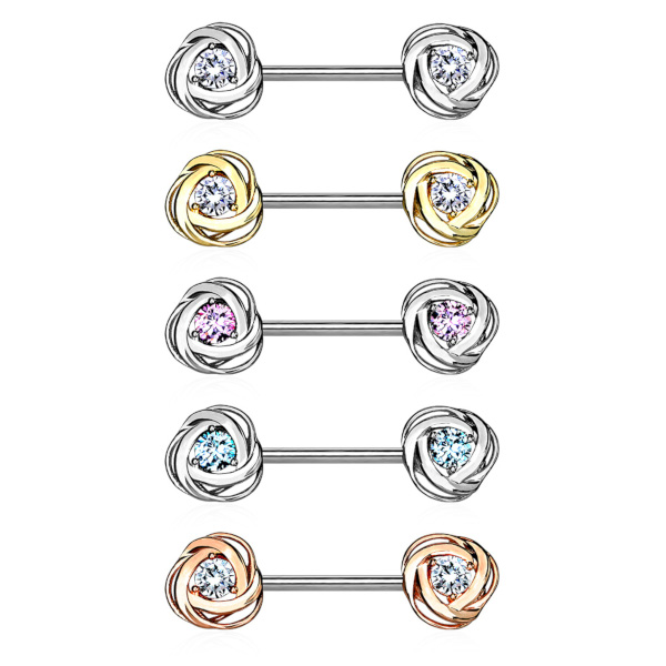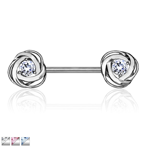 Украшение для груди со штангой из хирургической стали 316L с розами из родированной латуни, украшенными стразом по центру.