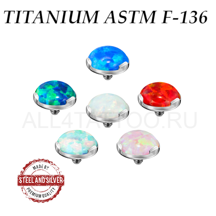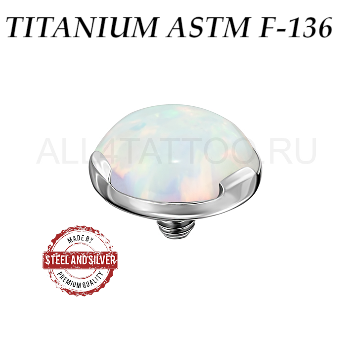 Накрутка из имплантационного титана ASTM F-136. Украшена ярким опалом. Резьба накруток 1,2мм подходит к микродермалам и украшениям толщиной 1,6мм с внутренней резьбой. За счет того что опал не в обкатке, а в закрепе из трех маленьких лапок - накрутка выглядит значительно ярче.