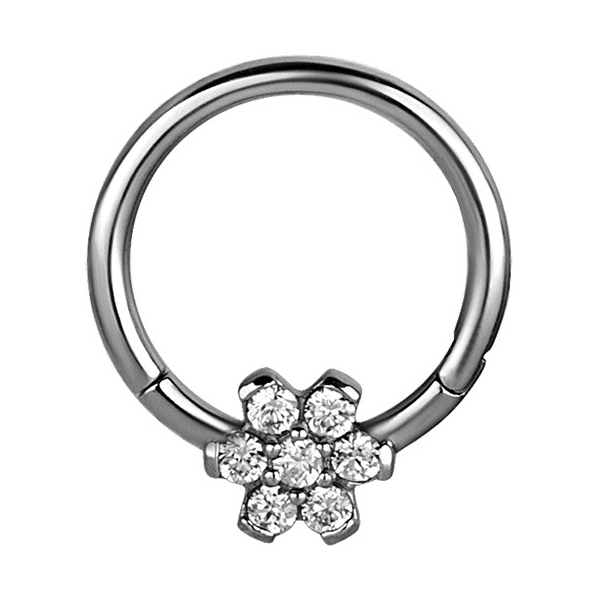 Кликер из хирургической стали 316L украшен цветком из фианитов. Диаметр цветка - 5,5 мм.