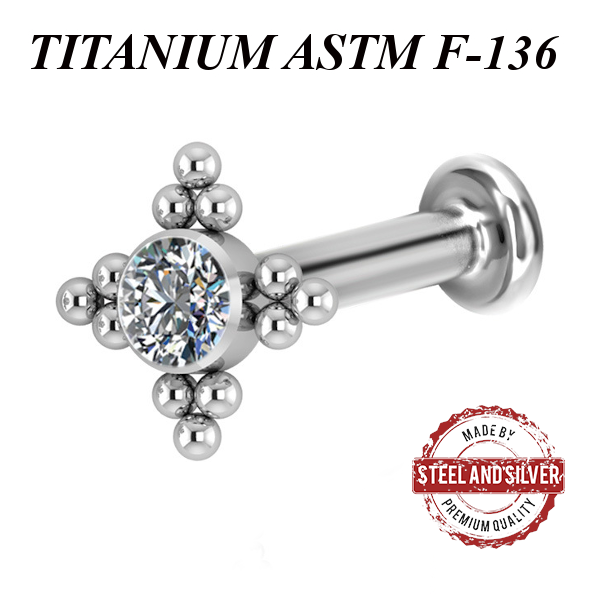 Лабрет из имплантационного титана 6Al-4V-Eli ASTM: F-136 с внутренней резьбой. Украшен Premium Crystals диаметром 3мм.