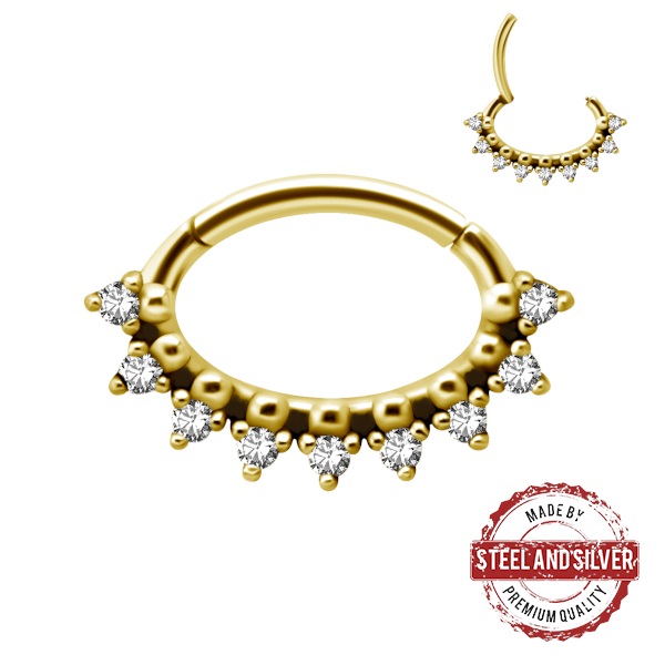 Кликер из хирургической стали 316L с PVD покрытием 24х каратного золота и чернением. Украшен кристаллами Premium Cubic Zirconia.