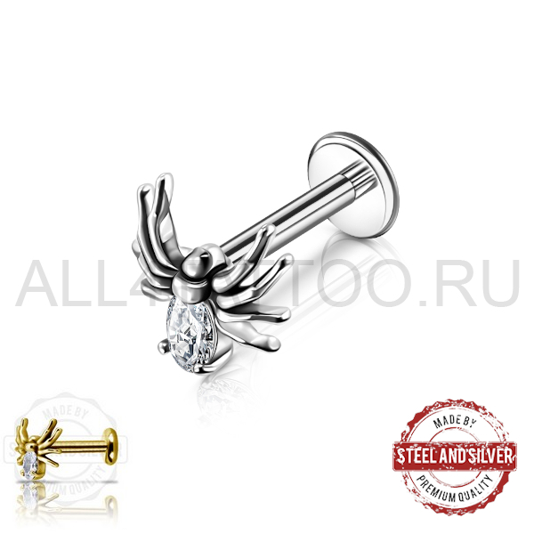 Лабрет из хирургической стали 316L с внутренней резьбой. Накрутка в форме паука размером: 6,5х6,5мм украшена Premium Zirconia. Представлен в двух вариантах: классический стальной и с 24х каратным золотым PVD покрытием.