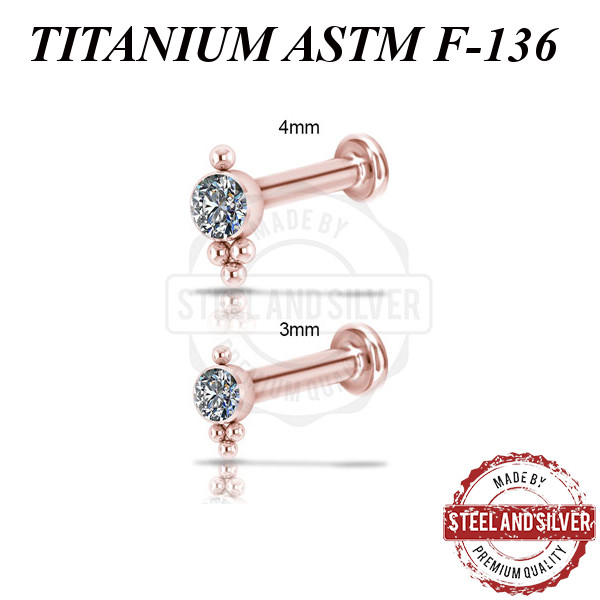 Лабрет с внутренней резьбой из имплантационного титана 6Al-4V-Eli ASTM: F-136 с PVD покрытием розового золота. Украшен кластером с Premium Crystals.