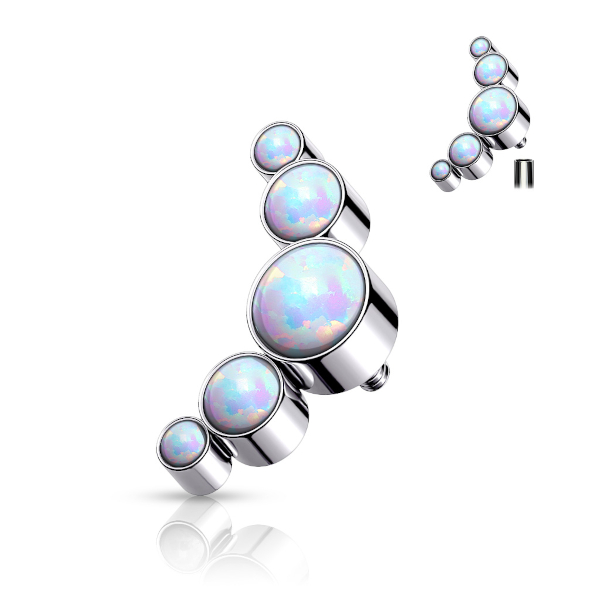 Кластер из хирургической стали 316L с пятью яркими искусственными опалами. Подходит для украшений с внутренней резьбой толщиной 1,6мм.