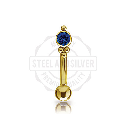 Микробанан с внутренней резьбой из имплантационного титана 6Al-4V-Eli ASTM: F-136 с PVD покрытием 24х каратного золота. Украшен кластером высотой 5.5мм c кристаллом Premium Zirconia.