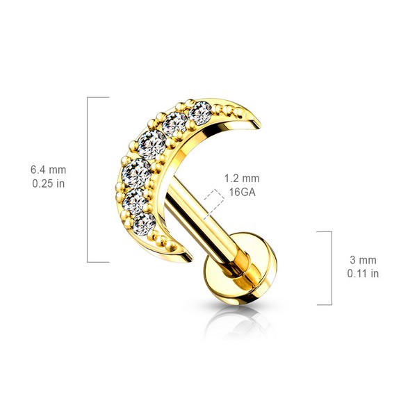 Лабрет с внутренней резьбой из хирургической стали 316L и накрутки из латуни с родированием. Украшен стразами. Размер декоративной части - 4,5х6,4мм. Представлена также вариация с золотым IP покрытием.