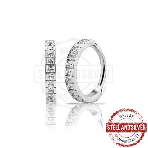 Кликер из хирургической стали 316L, украшен квадратными фианитами диаметром 2.5мм.