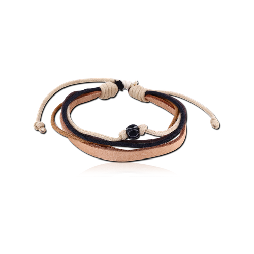 Браслет из кожаной полосы с бежевыми и коричневыми шнурками дополнен декоративной бусиной.