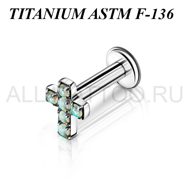 Лабрет из имплантационного титана 6Al-4V-Eli ASTM: F-136 с накруткой в форме креста, украшенного синтетическими опалами. Размер декоративной части: 4х6мм. Внутренняя резьба.