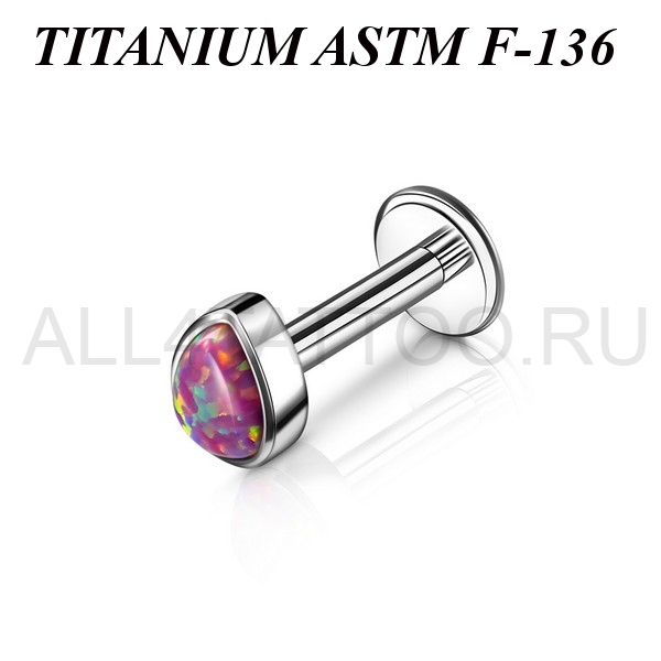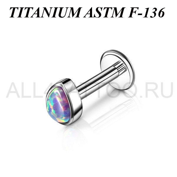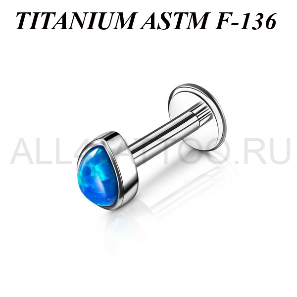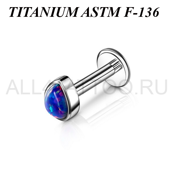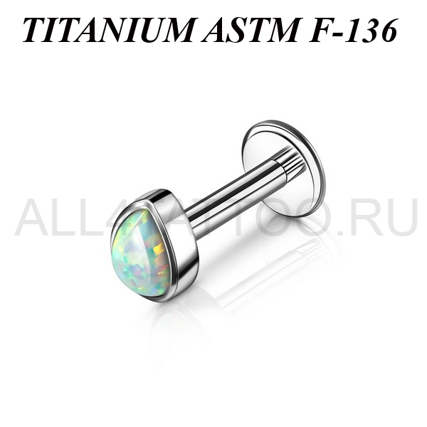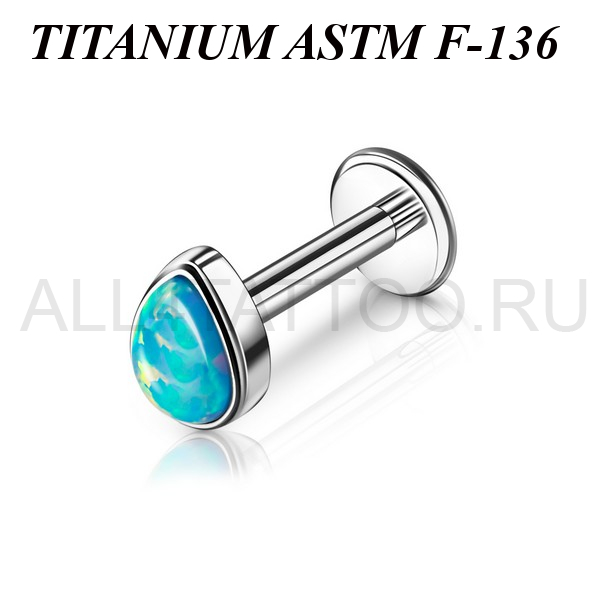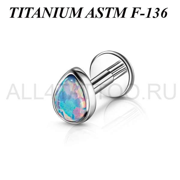 Лабрет из имплантационного титана 6Al-4V-Eli ASTM: F-136 с накруткой в форме капли, украшенной лабораторным опалом. Внутренняя резьба.