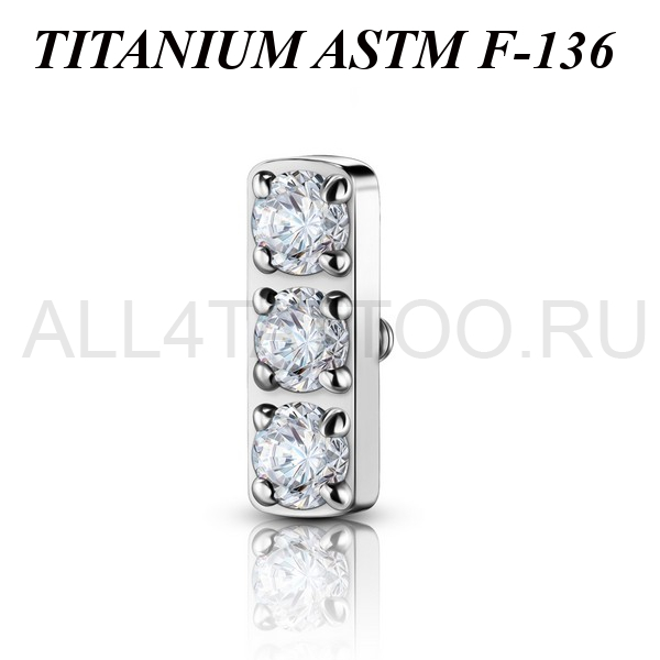 Накрутка из имплантационного титана 6Al-4V-Eli ASTM: F-136. Украшена тремя круглыми прозрачными фианитами. Размер декоративной части: 6х2мм. Подходит для украшений с внутренней резьбой.
