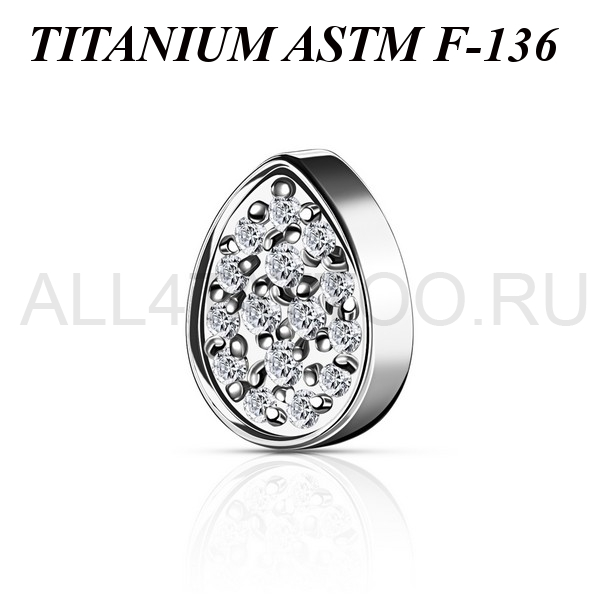 Накрутка из имплантационного титана 6Al-4V-Eli ASTM: F-136 в форме капли с множеством маленьких прозрачных фианитов. Размер декоративной части: 3,5х4,5мм. Подходит для украшений с внутренней резьбой толщиной 1 и 1,2 мм.