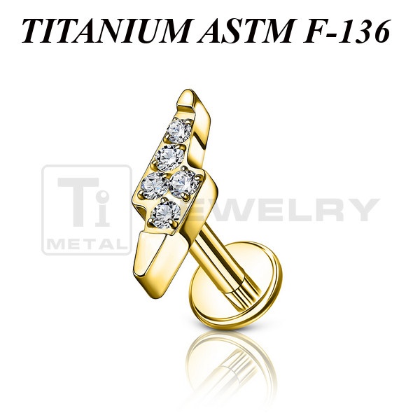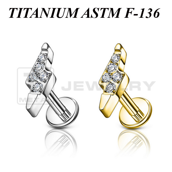 Лабрет из имплантационного титана 6Al-4V-Eli ASTM: F-136 с внутренней резьбой. Украшен накруткой в форме молнии с пятью прозрачными кристаллами . Размер декоративной части: 3х8,5мм.