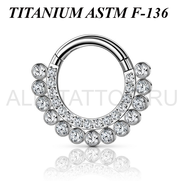 Кликер из имплантационного титана 6Al-4V-Eli ASTM: F-136 украшен россыпью фианитов. Количество фианитов варьируется в зависимости от диаметра украшения.