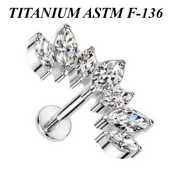 Лабрет из имплантационного титана 6Al-4V-Eli ASTM: F-136 с внутренней резьбой. Украшен кластером с семью прозрачными фианитами огранки "маркиз". Размер декоративной части: 12,7х6,6мм.