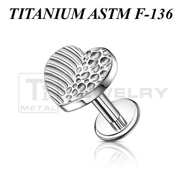 Лабрет из имплантационного титана 6Al-4V-Eli ASTM: F-136 с внутренней резьбой. Украшен накруткой в форме сердца с рельефными лунками.