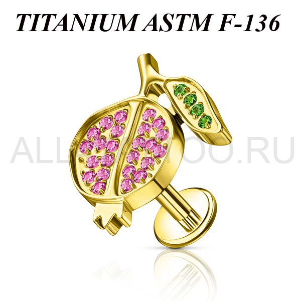 Лабрет с внутренней резьбой из имплантационного титана 6Al-4V-Eli ASTM: F-136 с золотым PVD покрытием. Украшен фигурной накруткой в форме граната с цветными фианитами. Размер накрутки: 10х12мм.