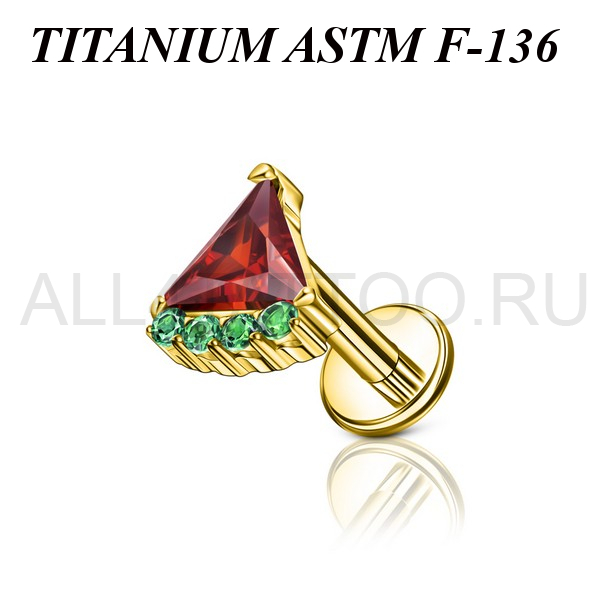 Лабрет с внутренней резьбой из имплантационного титана 6Al-4V-Eli ASTM: F-136 с золотым PVD покрытием. Украшен фигурной накруткой в форме дольки арбуза с цветными фианитами. Размер накрутки: 5,2х5,8мм.