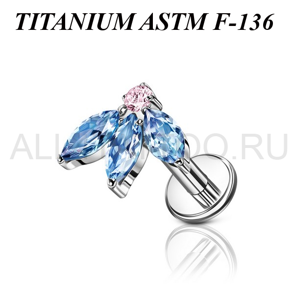 Лабрет с внутренней резьбой из имплантационного титана 6Al-4V-Eli ASTM: F-136. Украшен кластером с цветными фианитами. Размер декоративной части: 7,8х6мм.