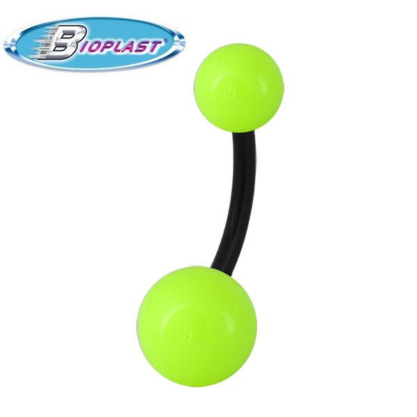 Банан из биопласта с шариками из акрила яркого неонового цвета. Атравматичен, идеален для тех кто занимается активными видами спорта. Диаметр нижнего шарика: 8мм, верхнего шарика: 5мм.