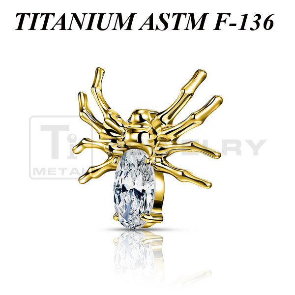 Фигурная накрутка из имплантационного титана 6Al-4V-Eli ASTM: F-136 с золотым PVD покрытием в форме паука. Украшена фианитом. Размер накрутки: 10х10,7мм. Подходит для украшений с внутренней резьбой толщиной 1 и 1,2 мм.