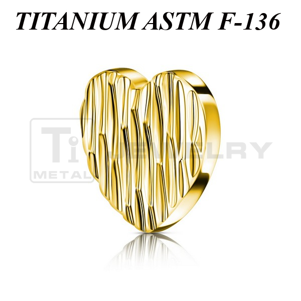 Накрутка из имплантационного титана 6Al-4V-Eli ASTM: F-136 в форме сердца с рельефной поверхностью. Представлена в двух вариантах: классическая титановая и с золотым PVD покрытием. Подходит для украшений с внутренней резьбой толщиной 1 и 1,2 мм. Размер накрутки: 5,6х5мм.