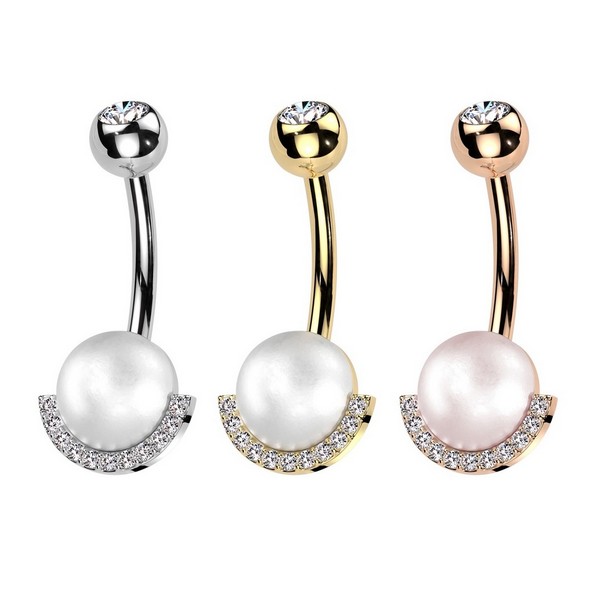 Банан из хирургической стали 316L с декоративной частью из родированной латуни. Украшен фианитами и имитацией жемчужины. Представлен в нескольких вариантах: классический стальной и с PVD покрытием жёлтого и розового золота. Размер декоративной части: 10,4х8,7мм, диаметр жемчужины: 7мм.