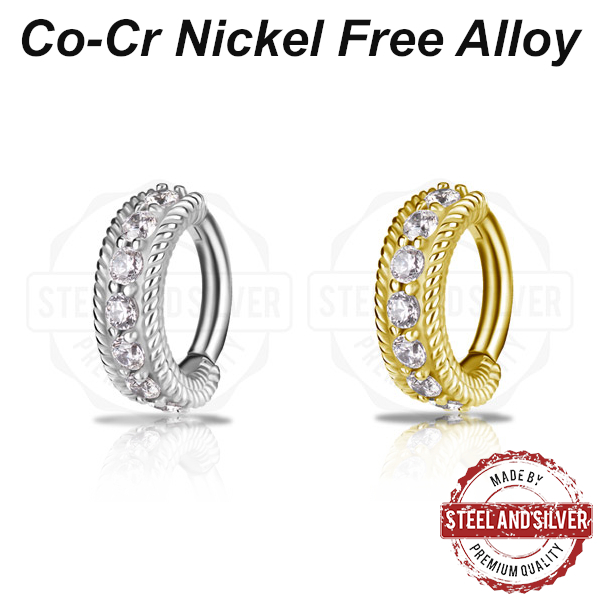 Овальный кликер из сплава кобальт-хрома, без содержания никеля. Украшен прозрачными кристаллами Premium Cubic Zirconia. Представлен так же вариант с 18-ти каратным PVD покрытием.