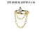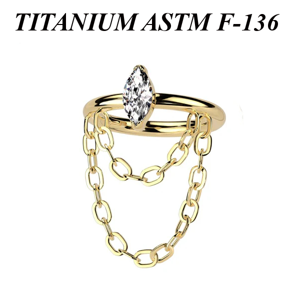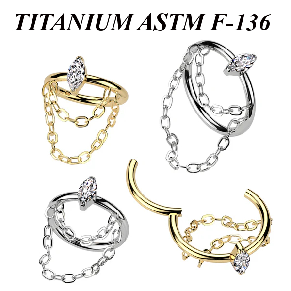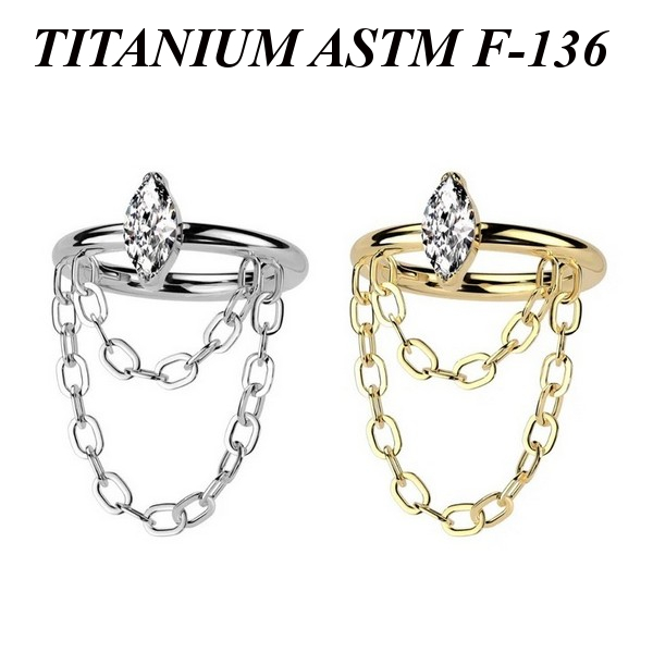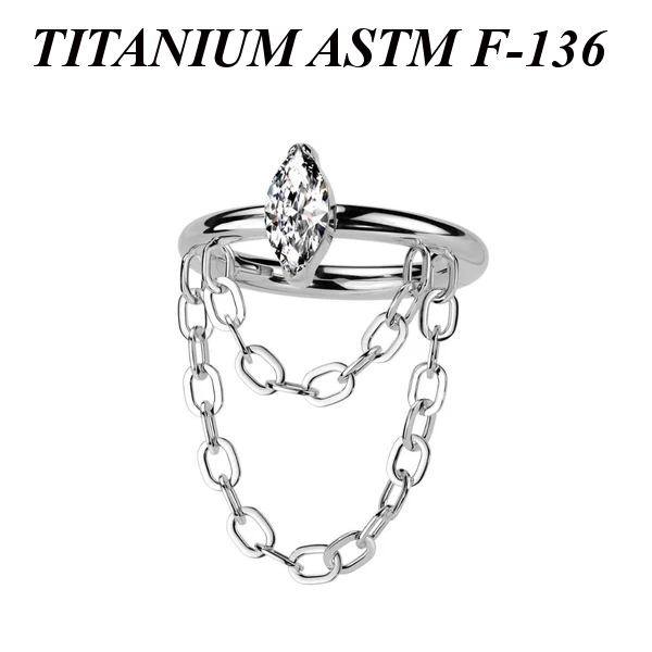 Кликер из имплантационного титана 6Al-4V-Eli ASTM: F-136. Представлен в двух вариантах: классический титановый и с золотым PVD покрытием. Украшен фианитом огранки "маркиз" и двойной цепочкой. Высота декоративной части: 15,5мм у 8мм и 17мм у 10мм.